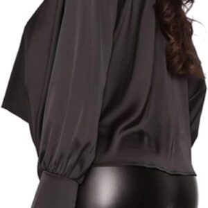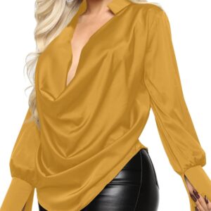 Women's Satin Collar Neck Drape Ruched Front Long Sleeve Blouse Shirt Top